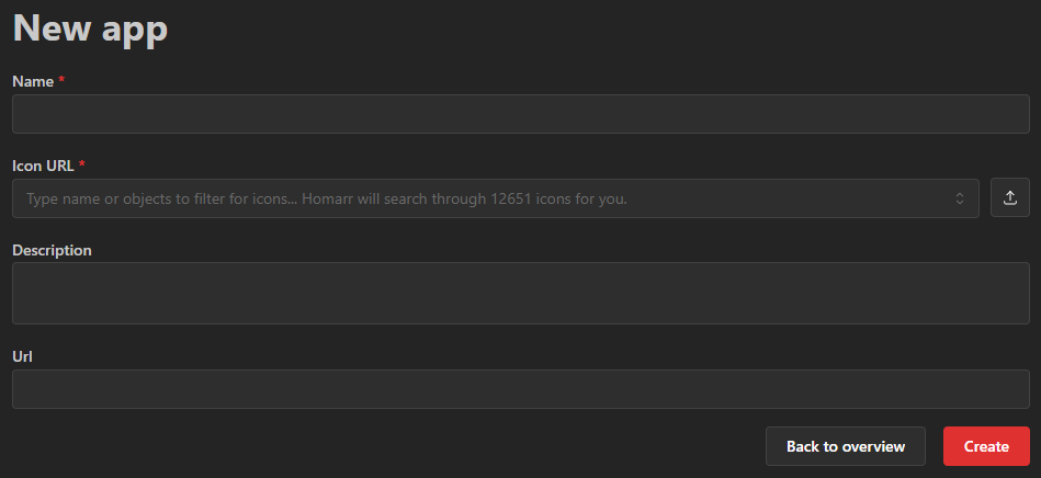 Next, click on the New app button. You'll need to provide a name and an icon to create an app. The name must be at least one character long but you can provide any image URL for the icon. Homarr ships with over 11K icons - so you can just search by entering a search text instead.