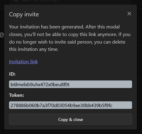 Next, click Create and you'll get a confirmation with an ID, Token and a link that can be copied: