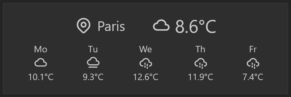 | Weather Location | Location selector, choose the city and it will automatically get you the coordinates. | City name | Paris |